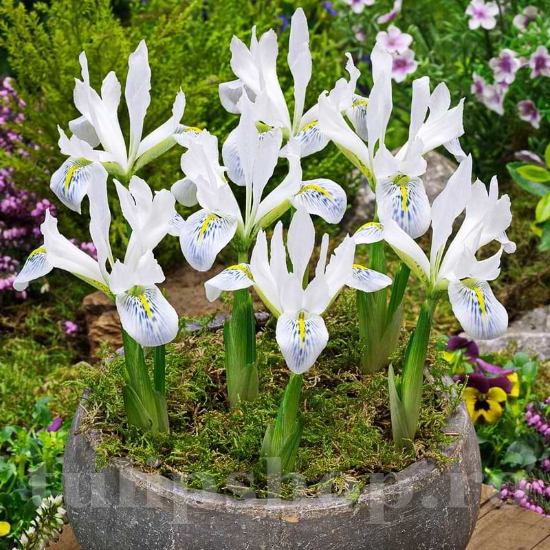 Bulbii de Iris Polar Ice se înmulțesc foarte bine în pământ și în câțiva ani vor crea un covor de flori albe ca zăpada cu pete albăstrui.